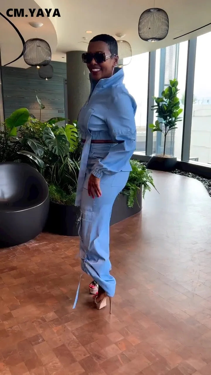 CM.YAYA Fashion Women's Set Long Sleeve Zipper Fly Track and Tie Up Hem Pocket Side Cargo Pants Suit 2024 Two 2 Piece Set Outfit